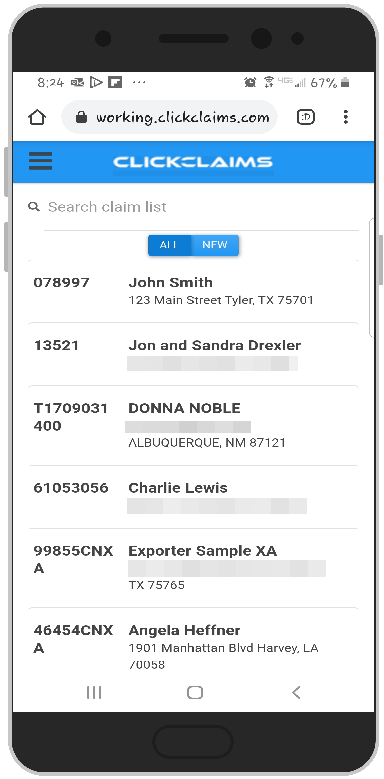 4. When viewing claims, populate the “Search claim list” bar with the full or partial claim #, insured first name, insured last name, or loss location address to display only the desired claim(s).