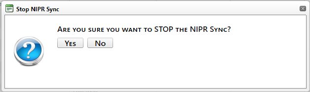 - A confirmation message displays stating, “Are you sure you want to STOP the NIPR Sync?”