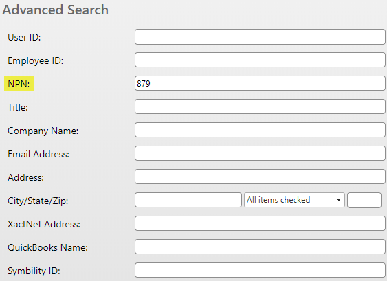 3. Enter the desired user’s exact or partial National Producer Number within the “NPN” search field found under the “Advanced Search” section of the page.