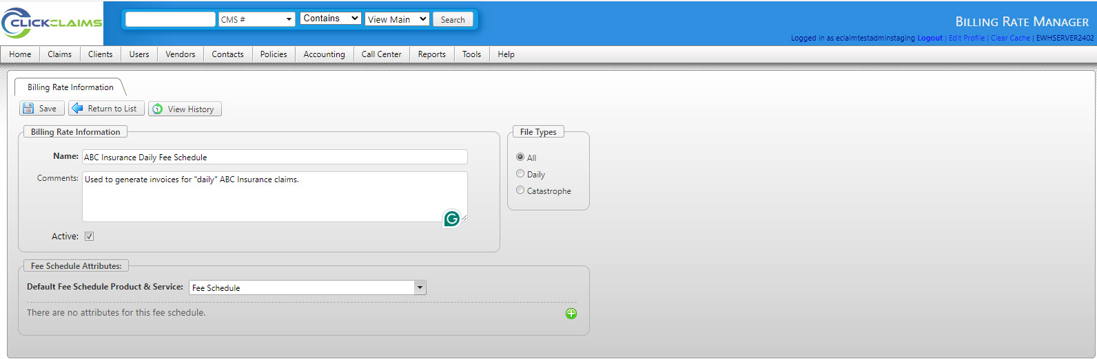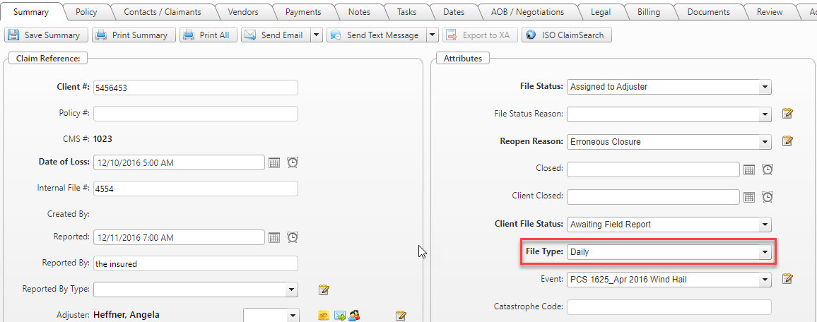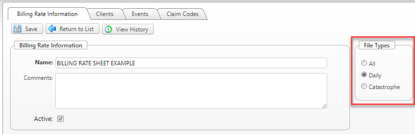 - For example, if "Daily" is selected, this BRS will only be available for selection when creating an invoice from the claim's "Billing" tab when "Daily" is selected in the claim's "File Type" field.