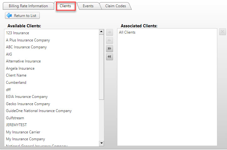 - Use the arrow buttons to toggle one or more clients between the "Available Clients" (not associated with the BRS) and "Associated Clients" (associated with the BRS) sections if this BRS should only be used to create invoices for claims associated to one or more specific clients. By default, the BRS is associated with all clients.
