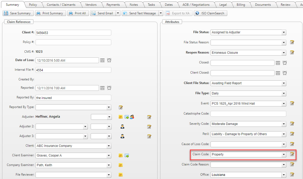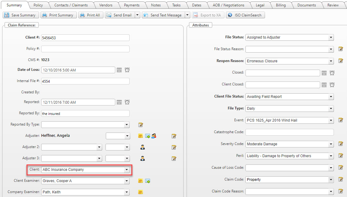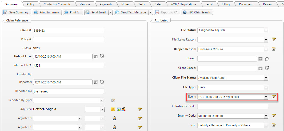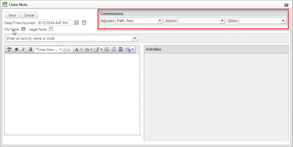 - Note: The "Adjuster Commission" field of the "Claim Note" window automatically defaults to the claim's assigned primary adjuster stakeholder, but this can be manually changed at the time of note creation.