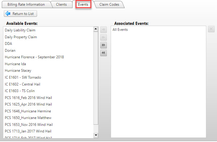 - Use the arrow buttons to toggle one or more events between the "Available Events" (not associated with the BRS) and "Associated Events" (associated with the BRS) sections if this BRS should only be used to create invoices for claims associated to one or more specific events. By default, the BRS is associated with all events.