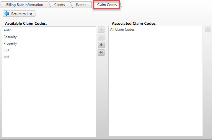 - Use the arrow buttons to toggle one or more claim codes between the "Available Claim Codes" (not associated with the BRS) and "Associated Claim Codes" (associated with the BRS) sections if this BRS should only be used to create invoices for claims associated to one or more specific claim codes. By default, the BRS is associated with all claim codes.