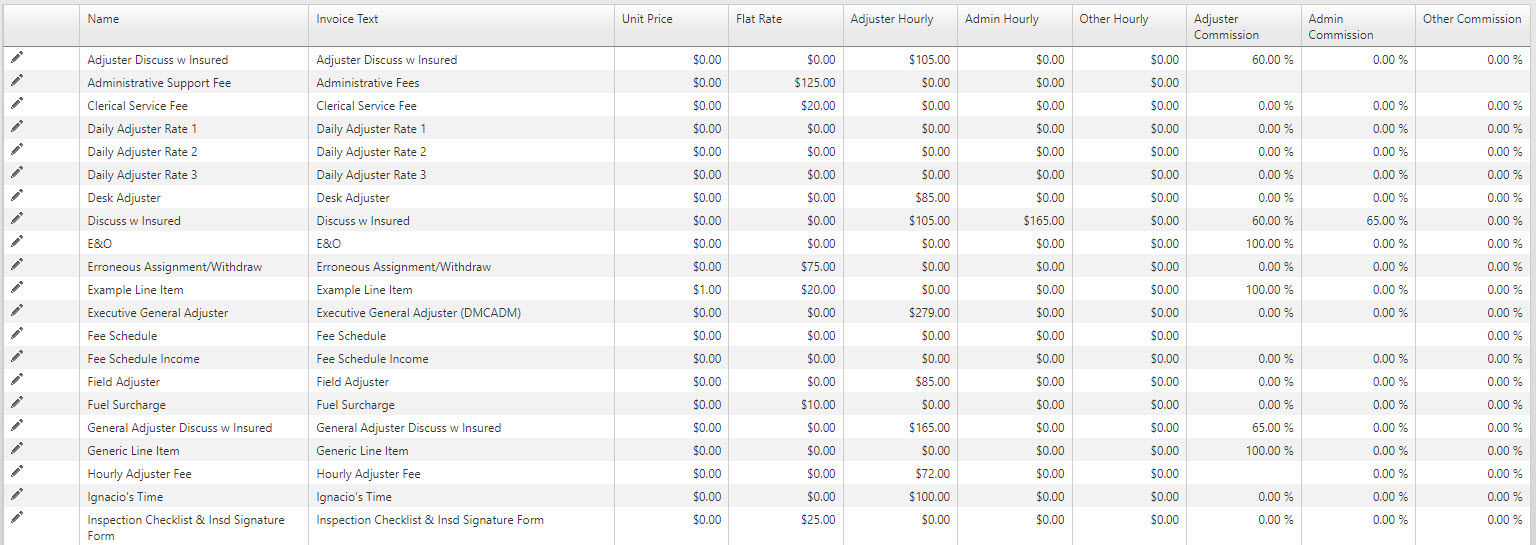 All Line Items configured in your ClickClaims site (via Accounting > Manage > Invoice Line Items) are displayed in the data grid section of the "Billing Rate Manager" page. By default, each Line Item shows the name, price, and commission settings as initially set on the "Manage Invoice Line Items" page. However, the configurations can be customized within each individual Billing Rate Sheet (BRS) as needed, allowing you to adjust the pricing model to fit the specific fee schedule you're working with.
