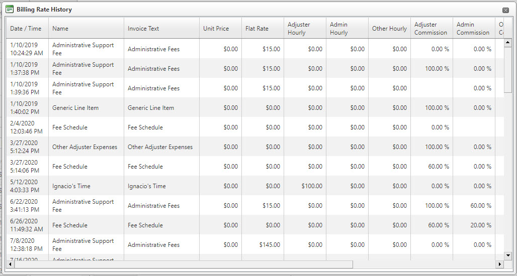button at the top of the page to view the "Billing Rate History" including details of changes made, the dates of those changes, and the individuals responsible.