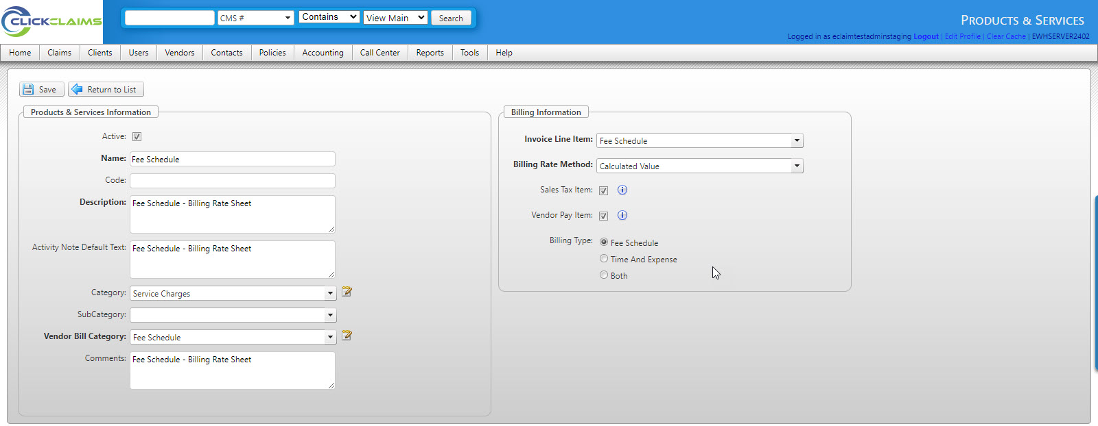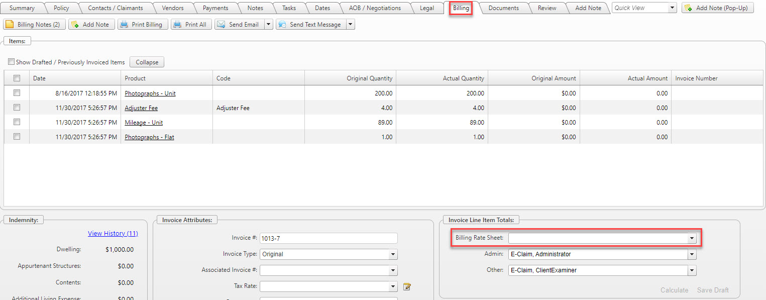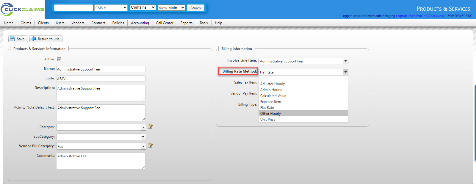 - Note: Only Product and Service Items configured with a "Billing Rate Method" of "Calculated Value" will appear in this field's drop-down list. This is because the selected Product & Service Item is used by the ClickClaims billing engine to calculate the claim's gross loss value based on the applicable tier of the BRS. This then determines the fee schedule component of the claim's invoice when the BRS is applied to generate the invoice.