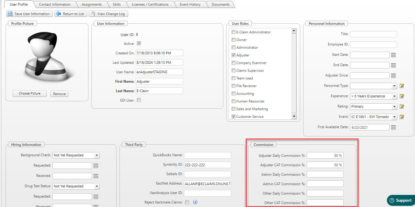 - Note: A site setting is available, which can be enabled upon request, allowing you to manage separate Adjuster, Admin, and Other commission rates for "Daily" and "Catastrophe" claims. Once enabled, enter the corresponding Daily or Catastrophe commission rates in the appropriate fields. ClickClaims will then automatically select the correct commission rate based on whether the invoice is associated with a "Daily" or "Catastrophe" file type.