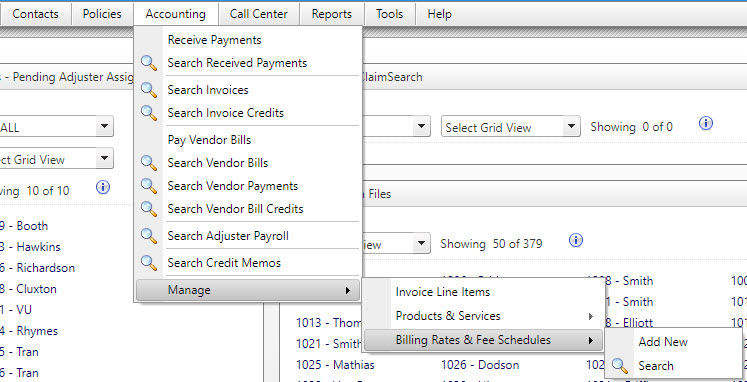 - Mouse over "Manage" from the drop list and mouse over or select "Billing Rates & Fee Schedules" from the fly-out menu.