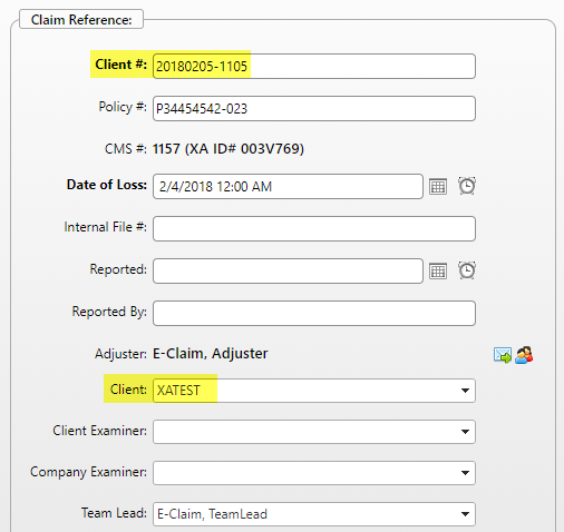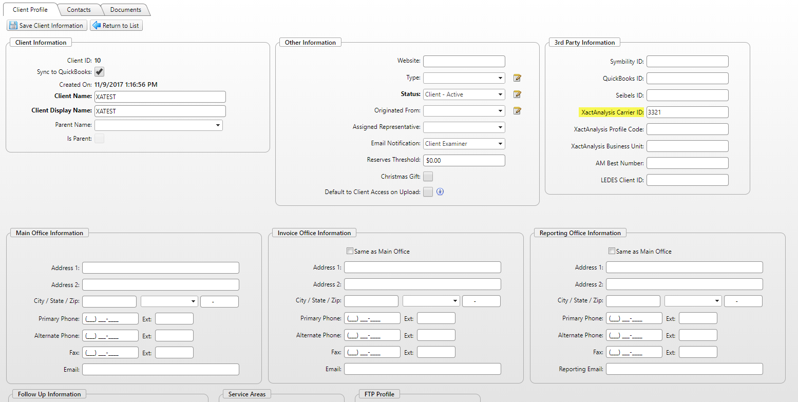 - The importer will process claims to the correct carrier (CMS Client), using the 'XactAnalysis Carrier ID', in each client's profile, as shown below. As with adjusters, the carrier profile must be updated with the XA ID prior to import, in order to create each claim under the correct client. Claims that do not match to any client will be created, but no client will be assigned.