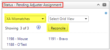- Claims imported into CMS from XactAnalysis that have an assigned adjuster with an XactNet Address that cannot be located within an adjuster’s user record in CMS will be located within the “Status – Pending Adjuster Assignment” widget by selecting “XA Mismatches” from the “List ALL” field’s drop-list.