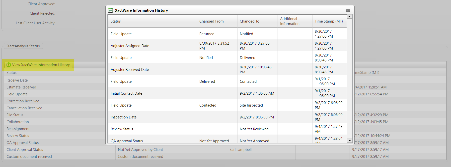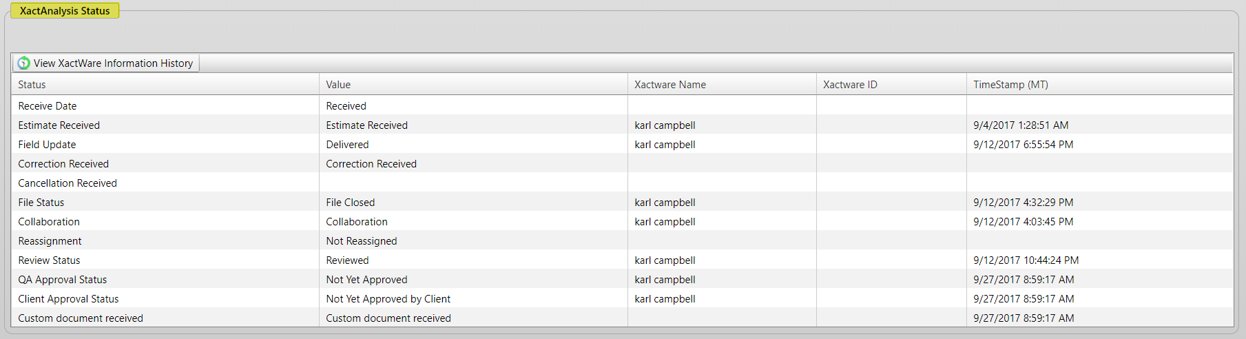 - Because the above events can occur multiple times during the lifecycle of the claim, the current value displays in the “XactAnalysis Status” section’s grid (the X Box), but the full history and chronology of all changes is tracked within “Xactware Information History” window which can be viewed by clicking the