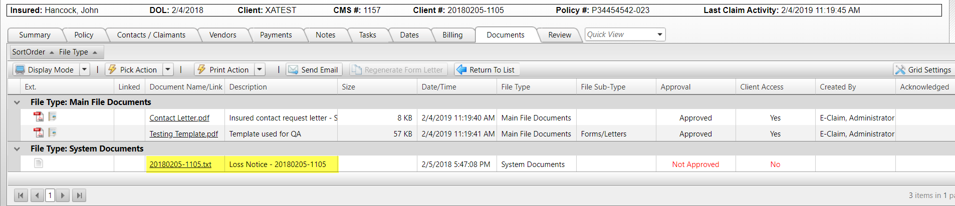 - The entirety of the assignment file is automatically saved as a .TXT file within the “System Documents” file type on the claim’s “Documents” tab so that full details of the assignment are available as a reference.