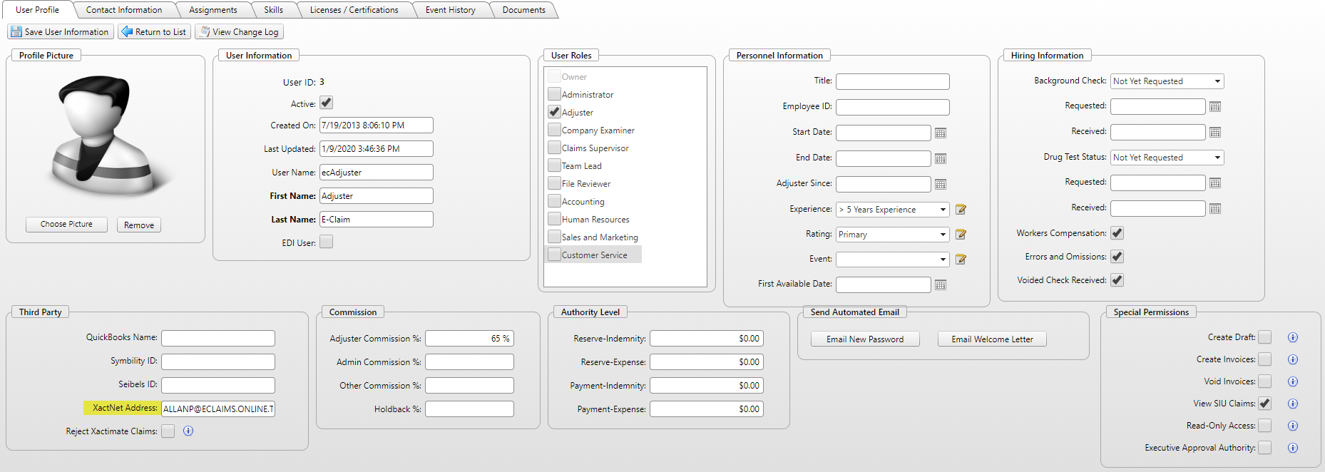 - Files received with the adjuster already assigned will be assigned to that adjuster in CMS. This is done via the “XactNet Address” field located within the user profile record: