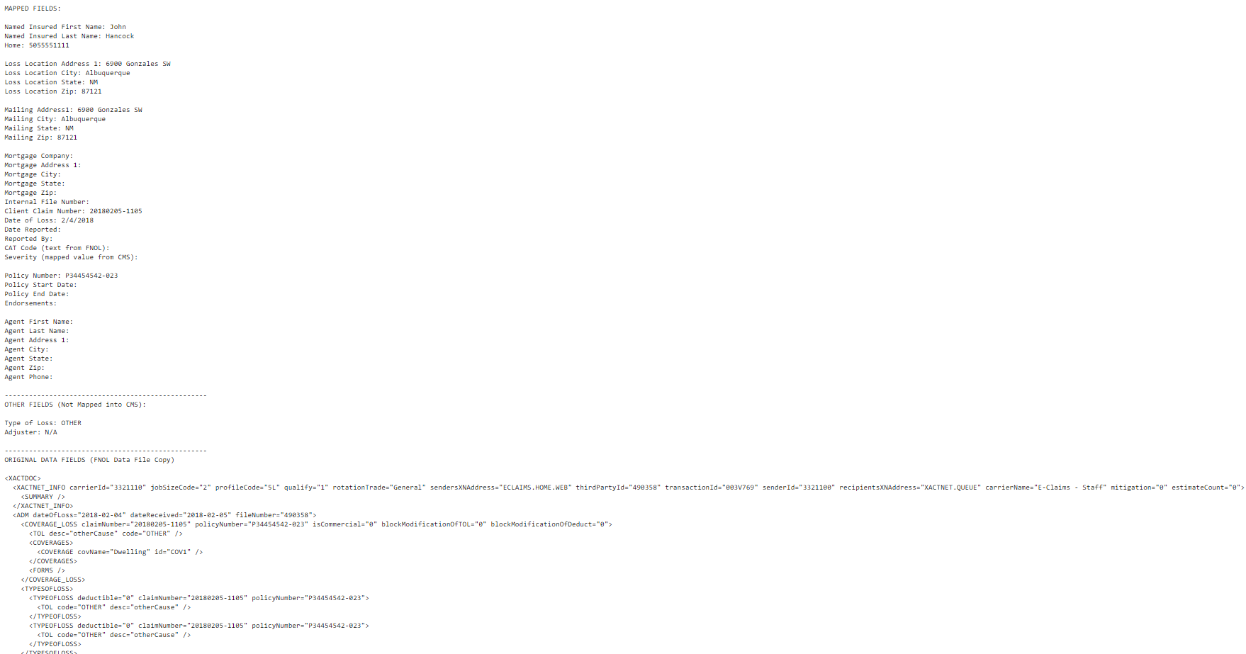 - As shown below, the mapped fields are labeled and displayed at the top of the .TXT file, with the full XML detail as received by XactAnalysis: